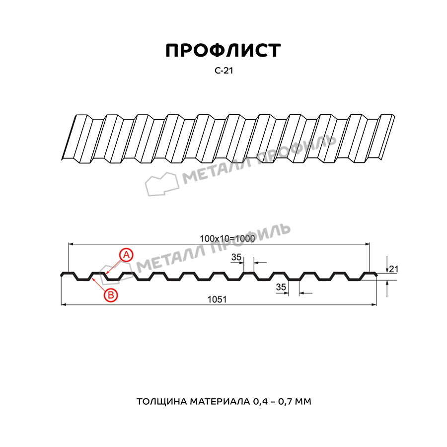 Профиль С-21 характеризуется трапециевидной формой волны с высотой 21 мм, что обеспечивает высокую несущую способность. Ширина листа составляет 1100 мм (полезная – 1000 мм), а длина может варьироваться по заказу. Толщина металла 0,45 мм делает его оптимальным для конструкций, где требуется баланс между легкостью и прочностью. Этот профиль подходит для монтажа на крышах с уклоном от 15 градусов, а также для вертикальных поверхностей, таких как заборы или стены.